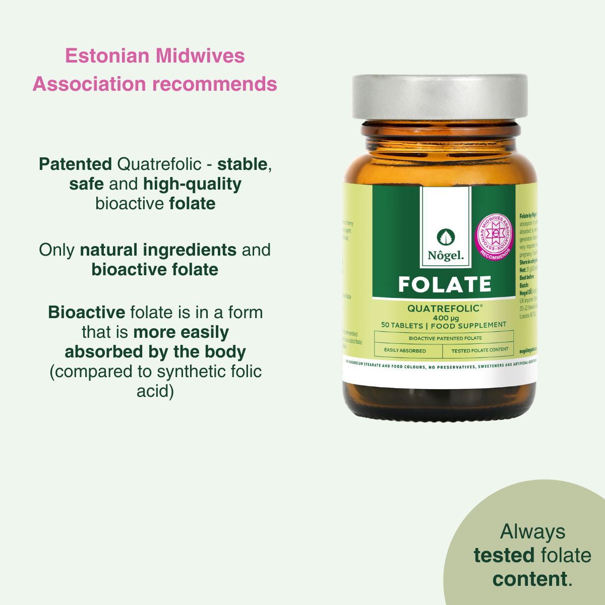 Daily dose 1 tablet includes 400 μg* of vitamin B9 as folate