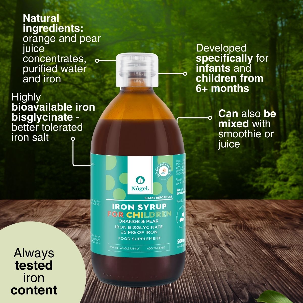 Preferably on an empty stomach, do not use dairy products with iron or products enriched with calcium. You can mix syrup with your favorite juice or smoothie. Some iron salts can stain teeth that usually comes o with cleaning. Use straw or rinse mouth with water. Do not exceed the stated recommended daily dose unless directed by a healthcare practitioner. Food supplements should not be used as a substitute for a varied diet. Keep out of reach of children. Shake before use!