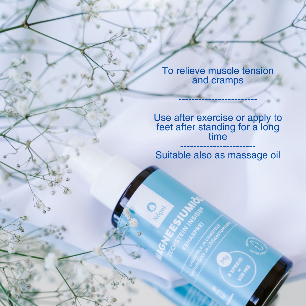 For the first time 8 sprays daily to different body areas. If needed, increase the amount to 30 sprays daily. 8 sprays (1 ml) includes 105 mg of magnesium. Spray on skin and rub. Let it work for 10 minutes and if needed, wash off. You do not need to wash off the product. During the first use you may feel some tingling that is normal. Great to use after a shower and before going to bed. For post-workout use, spray on the needed muscle area. Do not use on freshly shaved skin. Not for oral use!