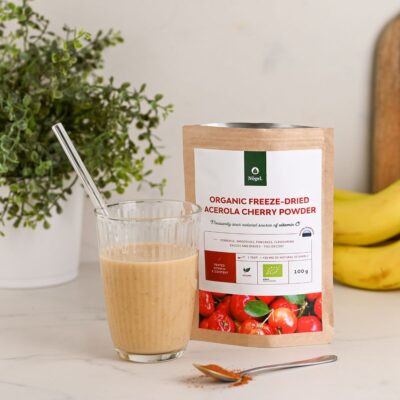 Organic freeze-dried Acerola Cherry powder is a real natural source of vitamin C that includes about 15% of vitamin C! Acerola adds a nicely sour flavour to yoghurt, muesli, smoothies and whatever drink you link to increase the content of vitamin C naturally! Tested vitamin C content after each batch.